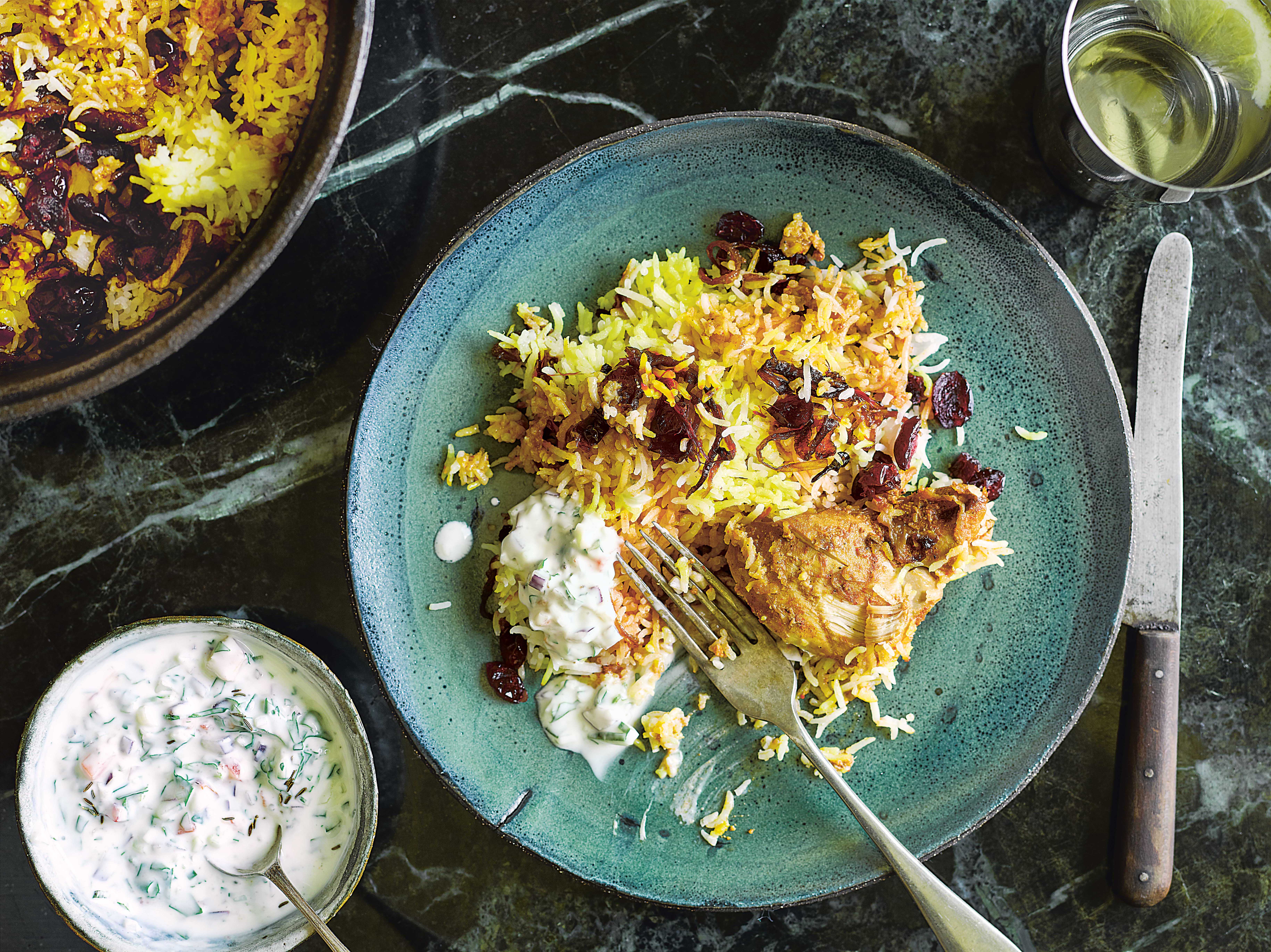 This chicken biryani is our homage to Britannia’s chicken berry pulao, using cranberries in place of the more authentic Persian barberries, which are tricky to find. (Despite much cajoling, Mr Kohinoor has never shared his wife’s famous recipe.) It is prepared in the kacchi style, originating from Hyderabad, in which marinated raw meat goes into the pot, to be cooked at the same time as the rice.